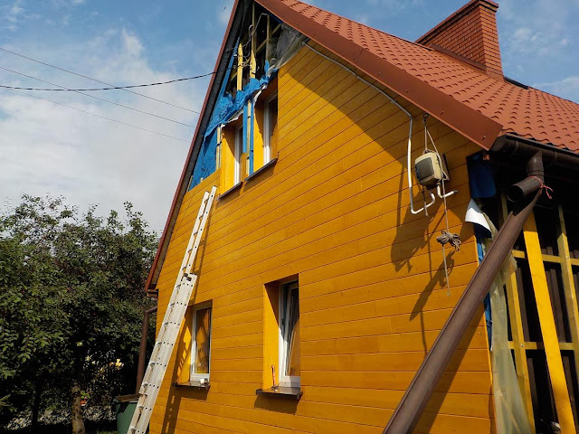 Sobota. Wczoraj chyba nie rozbiłem zdjęć. Albo robiłem i nie pamiętam. Wszystko przez przemęczenie. Dni zlewają się w jedno. Pobudka, śniadanie, młotek. Dźwięk wbijanych gwoździ. Deska, pędzel, drabina. Sen nie daje już ukojenia. Sni mi się że przybijam deski... Na południowej ścianie dojechałem do górnej krawędzi okien. Wyższy etap to będzie akrobatyka sportowa z elementami neurochirurgii - przewody z prądem umieszczone są w takim miejscu że po prostu zawadzają, będzie się trzeba pod nimi na wydrę przeciskać.